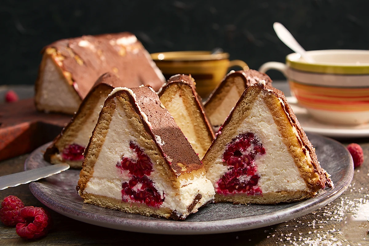 На средний ряд выкладываем толстой полоской 2-3 творога, перетертого с маслом и ванильным сахаром, по центру полоской — слой джема, или полоску банана, или ягоды/ сухофрукты, и сверху оставшийся творог. А дальше дело техники: поднять пищевую пленку за края так, чтобы сложить треугольный «домик», и отправить его на дощечке или коврике на холод хотя бы на пару часов.