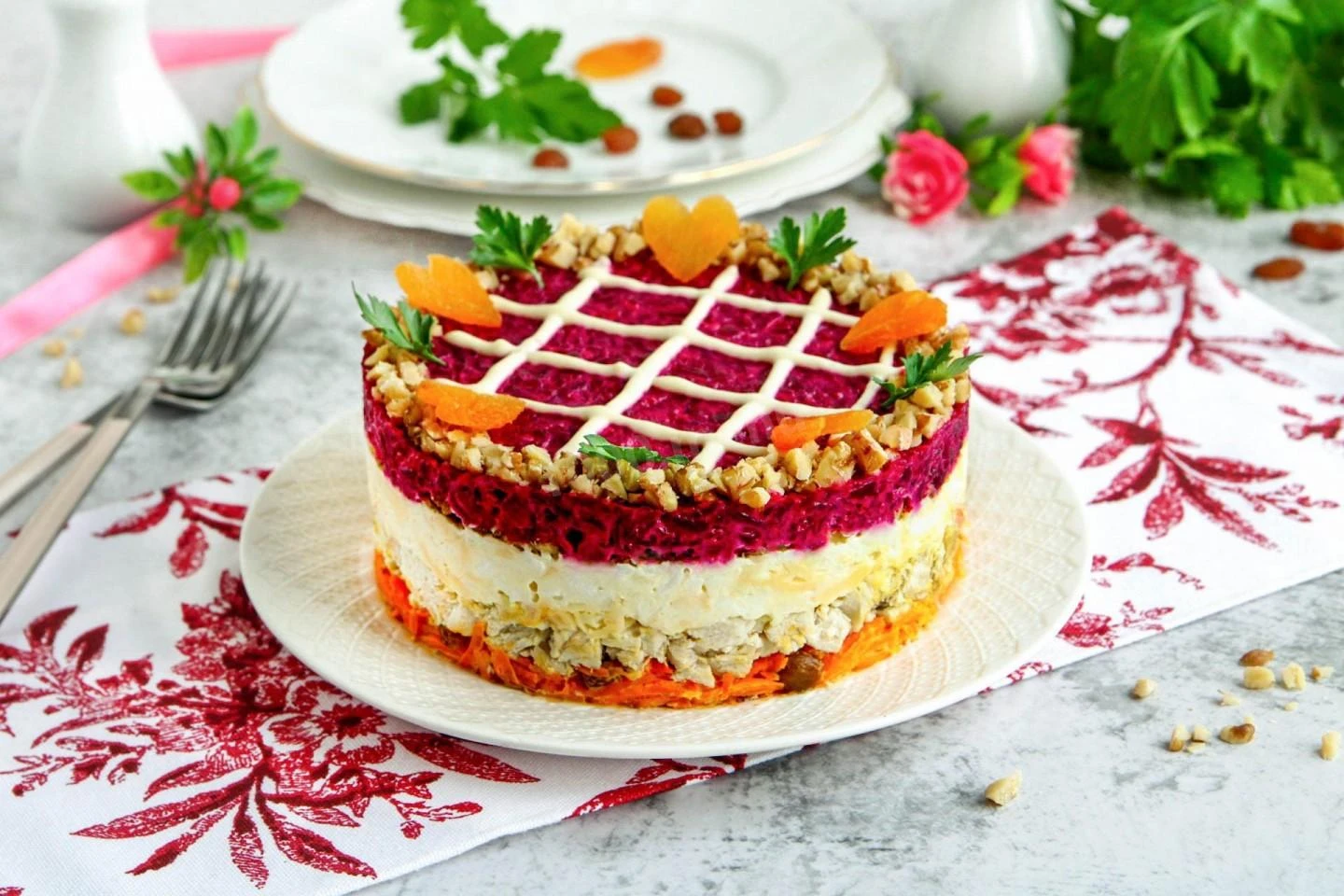 Первый слой — тертая морковь с изюмом (можно еще грецкие орехи, если любите), сверху покрыть сеточкой майонеза. Второй слов — тертая свекла с мелко нарезанным черносливом, сеточка майонеза. Третий — тертый сыр с чесноком, майонез. Хотя бы на несколько часов поставьте в холодильник, чтобы пропитался.