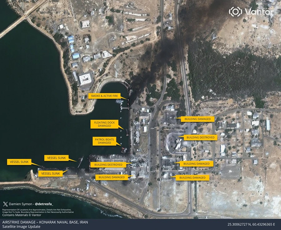 Спутники зафиксировали затопленные иранские корабли на военно-морской базе Конарак. В результате атаки затонули по меньшей мере три судна. Кроме потерь во флоте, на объекте зафиксированы повреждения инфраструктуры.